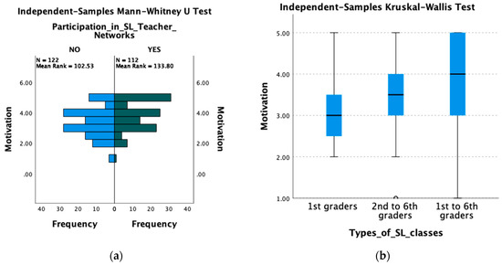Μotivation also appeared to vary when examined by some of the respondents’ biographical features. Interestingly enough, it appeared to be higher for those who have participated in SL teacher training networks (M = 3.83) during the past two years compared to those who haven’t (M = 3.37). A Mann–Whitney test indicated that this difference was statistically significant, U(Nyes = 112, Nno = 122) = 8658.00, z = 3.589, p < 0.001 (see Figure 3a). The difference in work satisfaction and creativity was also significant in relation to the types of classes the respondents teach, as indicated by the Kruskal–Wallis test, χ2(2) = 19.823, p < 0.001, with a mean rank score 83.99 for those who only teach to first graders, 108.05 for those who teach to second–sixth graders, and 137.46 for those who teach in both types of classes (see Figure 3b). We should also mention that a positive moderate correlation between washback on teaching and assessment and motivation was observed (r = 0.346, p < 0.001).