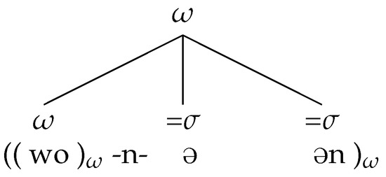 Swabian n-insertion is highly restricted at the level of a p-structure, in that it can only occur between a prosodic word and a preceding or following clitic. It can neither occur between two prosodic words, nor can it occur between two clitics. This limitation to the occurrence of n-insertion allows for deeper insights into the prosodic integration of the pronoun’s two forms. As will be discussed in more detail in Section 4, the occurrence of n-insertion allows us to infer that the enclitic [ə] is placed within the outer shell of a recursive prosodic word (), while [i:] can form the head of a recursive prosodic word itself ().