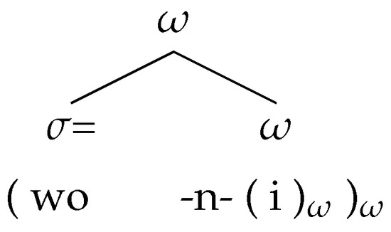Kabak and Schiering note (but dismiss) the most obvious analysis of the data, where prosodic word status would be assigned to the first function word ([vou]) in order to explain the encliticization of the second function word. Both would then be grouped in a nested prosodic word (8).