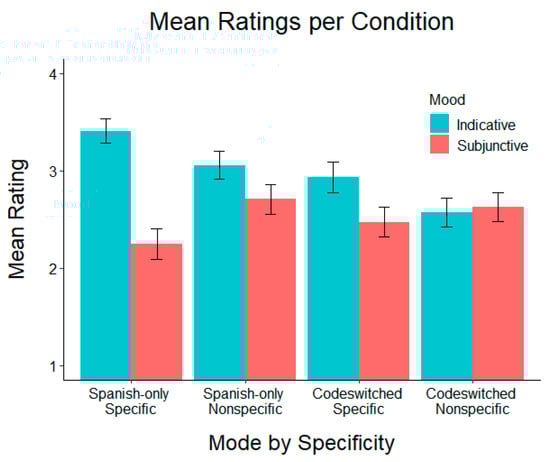 The four variations of each of the 11 sentences resulted from the manipulation of language mode (bilingual vs. monolingual) and mood (indicative vs. subjunctive). He showed that, in monolingual Spanish sentences, the indicative, as in (2b), was almost categorically rejected (Mean rating: 0.3/3), while, in CS sentences, it (2d) was accepted at a higher rate (Mean rating: 1.6/3). Lastly, in (), which involved the exact same design and materials as the current study, 24 Spanish HSs rated sentences with relative clauses manipulated for specificity of the antecedent and mood in two sessions: a Spanish monolingual and a CS session. Participants exhibited a CS effect, whereby the preference for the subjunctive with nonspecific antecedents was not significant in the CS session, while it was in the Spanish monolingual session. These results are relevant to the current study, since they indicate that there is a CS effect on mood selection in HSs. Specifically, it shows that the association of the subjunctive with nonspecificity is present in monolingual mode but not in bilingual mode. It resembles the masculine default effect in Spanish–English CS in some communities in the U.S. in that, in CS, the grammar of the Spanish segment does not follow monolingual Spanish tendencies, and a default form is used instead. For L2 learners, this knowledge cannot be derived from proficiency in Spanish, as it is an aspect of CS not related to the I-language.