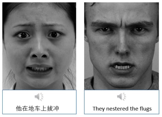 An example of bimodal stimuli from each culture. In the left-hand panel, an Asian face is paired with meaningless Mandarin speech (East Asian culture). In the right-hand panel, a Caucasian face is paired with meaningless English speech (Western culture). (Asian face—Image ID fea118: Adapted with permission from Chen and Yen (2007); Mandarin pseudo-sentence: Adapted with permission from Liu and Pell (2012); Caucasian face—Image ID AM08ANS: Adapted with permission from Lundqvist et al. (1998); English pseudo-sentence: Adapted with permission from Pell et al. (2009).)