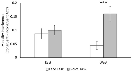 Modality interference effects in accuracy rates (bimodal congruent trials minus bimodal incongruent trials). A larger modality interference in the face task represents greater interference from the auditory modality, whereas a larger modality interference in the voice task represents greater interference from the visual modality. Chinese-English bilinguals experienced a larger modality interference in the voice task than in the face task for the emotional information from the West (i.e., visual interference). Error bars represent standard error. *** p < 0.001.