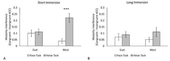 Modality interference effects in accuracy rates (bimodal congruent trials minus bimodal incongruent trials) for Chinese-English bilinguals immersed in North America for a short duration (A) and long duration (B). The short immersion group showed a larger modality interference in the voice task than the face task for the emotional information from the West (i.e., visual interference). The long immersion group showed no differences between tasks in both cultures. Error bars represent standard error. *** p < 0.001.
