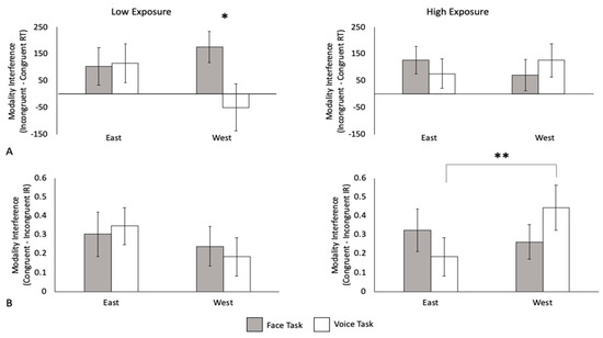 Modality interference effects on (A) response times and (B) intensity ratings for bilinguals with low (left panels) and high (right panels) levels of exposure to the U.S. culture. The low exposure group showed a larger modality interference in the face task than in the voice task for emotional information from the West (i.e., auditory interference). The high exposure group showed a larger modality interference for Western than Eastern emotional information in the voice task, but no differences in modality interference between cultures in the face task. * p < 0.05, ** p < 0.01.