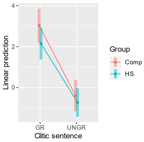 In order to establish a baseline for grammaticality, we first compared the ratings of fillers with grammatical and ungrammatical clitics. The average rating for grammatical clitic sentences was 4.41 for both groups (4.30 for the HS group) and 2.58 for ungrammatical sentences with clitics (2.55 for the HS group) on a scale of 1–5. An ordinal logistic regression in R (R Core Team 2021) using the ordinal package (Christensen 2019), with ratings as the output and item (grammatical or ungrammatical clitic sentence), group and item by group interaction as predictors, resulted in a significant main effect of item (Item(Grammatical) β0 = 3.43, SE = 0.51, p < 0.0001) but not for group (Group(HS) β0 = −0.33, SE = 0.33, p = 0.32) and the interaction between item and group (Item(Ungrammatical) × Group (HS) β0 = 0.55, SE = 0.29, p = 0.05). Grammatical clitic items were 30 times more likely to be rated highly compared to ungrammatical clitic items, more of the effect coming from the rating of grammatical items, as the interaction in Figure 1 shows.