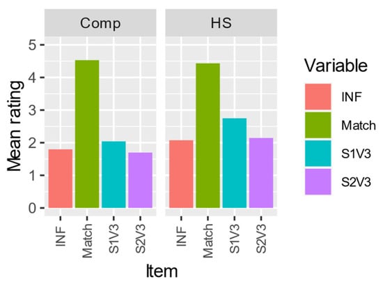 Looking at the experimental items, Figure 2 presents the mean acceptability ratings for different conditions by group.7 As expected, agreement-matching sentences were ranked highest, followed by S1-V3 mismatching sentences, S2-V3 mismatching sentences and infinitival sentences. HS speakers rated mismatching sentences higher than the comparison group, suggesting higher tolerance for mismatches.