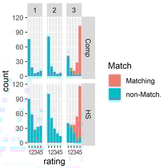 Figure 3 shows the acceptability ratings by person and agreement matching. In this figure, we can see that the lowest ratings correspond to agreement-mismatching items (in blue), and the highest ratings to agreement-matching (in red). Participants gave more 4–5 ratings to 1st person than to 2nd person and 3rd person, mismatching subjects.