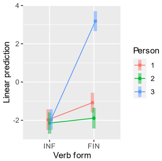 Results in Table 6 show that Form and Proficiency were significant predictors. Specifically, finite forms were 2.4 times more likely to receive a higher rating than non-finite forms, and higher proficiency lowered the odds of higher ratings. More importantly, Person significantly interacted with finite Form. Form-Person interactions are illustrated in Figure 4 (person refers to subjects): 3rd person subjects had a significantly higher effect on rating for finite forms than for non-finite, as expected since finite forms include matching, but 1st person also had a significantly higher effect on finite forms than on non-finite verbs. Post-hoc pairwise comparisons for verb form and person found that only finite forms had significant contrasts between 1st and 2nd person subjects (Bonferroni adjusted p = 0.0007), as well as 1st and 3rd and 2nd and 3rd (p < 0.0001) although the latter two are not relevant for our purpose, since 3rd person subjects include matching S3-V3 and non-matching S3-Vinf items. Non-finite forms, on the other hand, had no significant contrasts between persons.