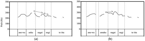 Pitch curves of (1) [A female speaker]: (a) ane-wa aóku nagái négi to itta; (b) ane-wa amaku nagái négi to itta. (9).