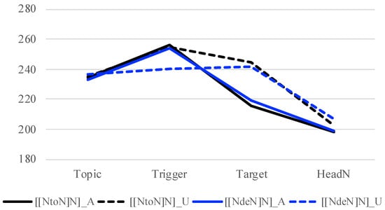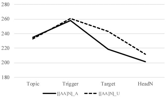 | 16 | The mean scores were 3.68 for [A-i [A-i N]], 4.31 for [A-na [A-na N]], 4.88 for [A-i [A-na N]] and 5.50 for [A-na [A-i N]]. A mixed-effects analysis (with speaker as random effects) revealed that the scores for [A-na [A-na N]] (β = 0.6230, p < 0.01), [A-i [A-na N]] (β = 1.1967, p < 0.001) and [A-na [A-i N]] (β = 1.8197, p < 0.001) are individually higher than the score for [A-i [A-i N]]. |