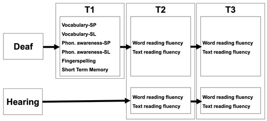 The deaf children were tested once a year on three different occasions: Time 1 (T1), time 2 (T2), and time 3 (T3; see Figure 1). Word and text reading fluency were assessed (T2 and T3) for both deaf and hearing children. The children were individually tested in a quiet room at the child’s school in 3 different sessions of approximately 15–20 min, 1 session a day across 3 consecutive days.