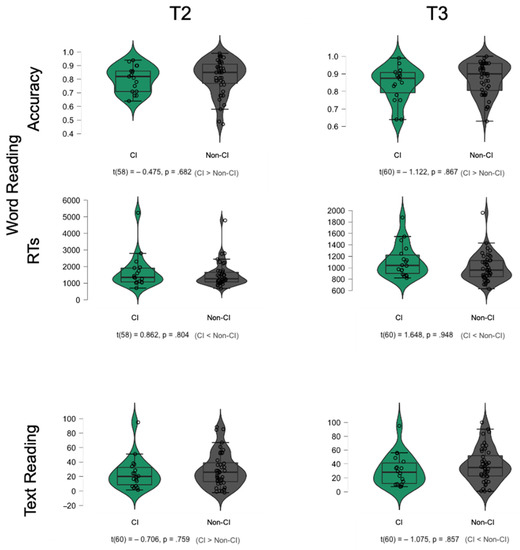 Independent samples t-tests showed that the deaf children with and without a CI did not perform significantly differently in word or text reading fluency assessment at T2 and T3 (all ps > 0.7) and were therefore treated as a single group in all the analyses. Figure 2 shows the violin plots and t-test results for each of the study measures.