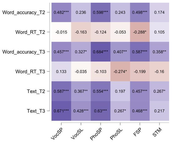 The correlations among the predictor variables and word and text reading performance for deaf children at time 2 and time 3 with age partialled out are shown in Figure 3. As can be seen, all the predictor variables showed a significant correlation (p < 0.05) with at least one of the dependent measures even after controlling for the variance linked to age. Therefore, all predictor variables were included in the stepwise regression analyses (see Cates et al. 2021 for a similar approach in a recent study with deaf adult readers).