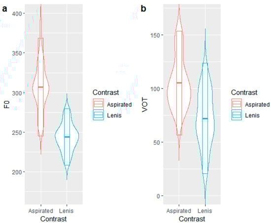 Violin plots of the lenis–aspirated stop contrast in the stimuli. (a) shows the comparison of F0, and (b) shows the comparison of VOT.
