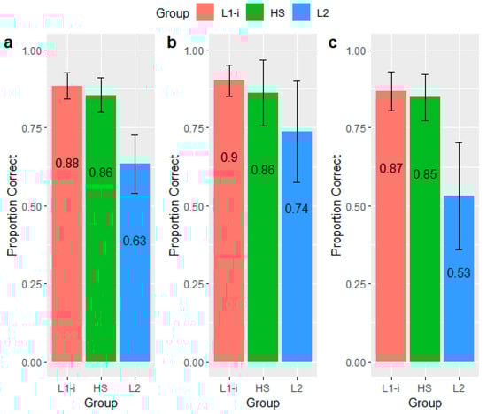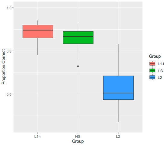The results of the mixed-effects logistic regression model showed that the HS group was not significantly different from the L1-i group (p = 0.23) while being significantly different from the L2 group (β = −2.01, SE = 0.16, p < 0.001) in terms of the accuracy of their discrimination responses. A pairwise post hoc analysis using multiplicity adjustment, averaged over type and speaker, confirmed the result while also indicating that the estimated mean of the L1-i group and that of the L2 group were significantly different (β = −1.78, SE = 0.16, p < 0.001). As shown in Figure 2, the HS group was similar to the L1-i group in terms of the accuracy in the AX task, while both were considerably more accurate than the L2 group.