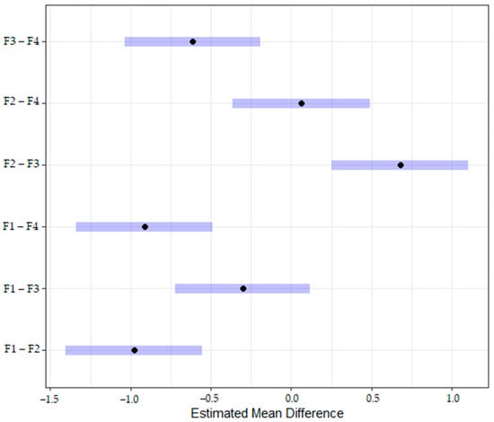 Estimated mean difference by each pair of speakers. F1–F4 refer to each female speaker who recorded the stimuli.