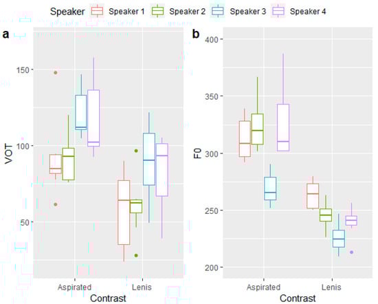 Box plots of the lenis–aspirated stop contrast separated by speaker. (a,b) show a comparison of VOT and F0, respectively.