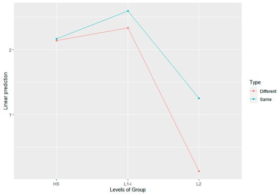Linear prediction of the interaction effect between group and type. Y-axis represents the estimated means (coefficients) for each group in the pairwise post-hoc analysis of the mixed-effects logistic regression model.