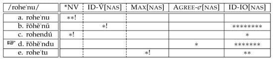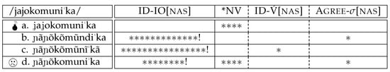 - ID-[nas]: Assign a violation for an instance in which the output value for the feature [nasal] does not match the input value for a stressed vowel.