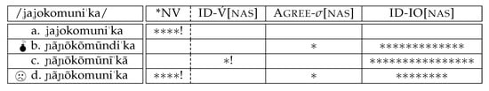 - Agree-[nas]: Assign a violation for each instance in which adjacent syllable nuclei do not agree in their values for the feature [nasal].