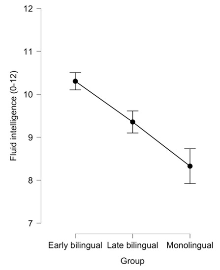 To probe further, we carried out an additional set of (exploratory) analyses. Because these analyses are exploratory, they should be interpreted with extra caution. First, we directly compared late bilinguals with monolinguals. Fluid intelligence was greater in late bilinguals than monolinguals, t(109) = 2.20, p = .030, d = 0.42 (two-tailed).