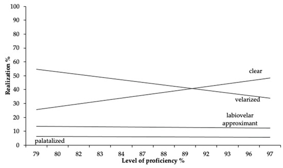 The effect of level of proficiency on the realization of the L3 Polish lateral (in percentages).