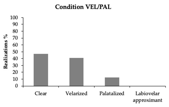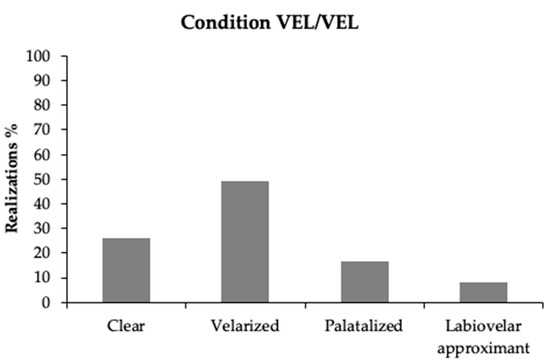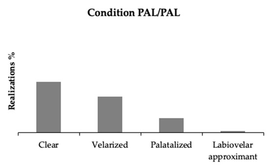 The second research question referred to the way that the L3 Polish lateral was influenced by the pronunciation of the lateral in cognate vocabulary in background languages (Ukrainian and Russian). In condition VEL/VEL, in which both background languages apply a velarized lateral in the cognate items, most participants’ L3 productions were also velarized (Figure 2). In condition PAL/PAL, with both background language cognates having a palatalized lateral, the tendency was to produce a clear lateral followed by a velarized lateral (Figure 3). The same tendency was visible in condition VEL/PAL in which the Ukrainian cognate had a velarized and the Russian cognate had a palatalized lateral (Figure 4). When no cognates were available in the background languages, as in condition NoCog, clear and velarized realizations were the most common (Figure 5). The difference between the clear and velarized lateral reached statistical significance in condition VEL/VEL and PAL/PAL (p > 0.001, p > 0.001, respectively), but it did not reach statistical significance in conditions VEL/PAL and NoCog (p = 0.121, p = 0.342, respectively).