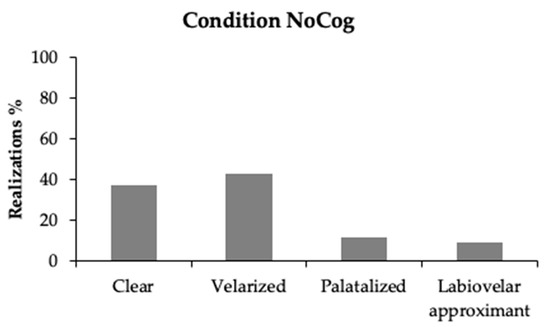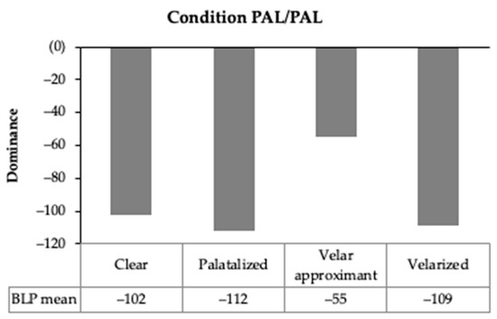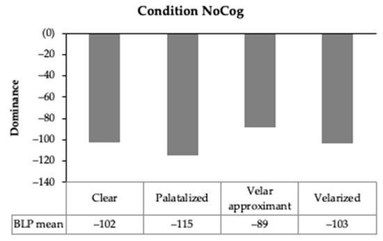 The second part of the third research question referred to the interaction of language and dominance. The analysis demonstrated that the interaction was not visible in condition VEL/VEL (Figure 7). In condition PAL/PAL (Figure 8), the labiovelar approximant was chosen by the more balanced speakers than the other realizations of the lateral. In condition VEL/PAL (Figure 9), more Ukrainian-dominant speakers (with lower BLP mean scores) produced a velarized lateral rather than a palatal or clear lateral. In condition NoCog (Figure 10), more Ukrainian-dominant speakers were more likely to produce a palatalized lateral than a clear or velarized lateral. Finally, in the last condition, the labiovelar approximant was produced by more balanced speakers than the other realizations of the lateral.