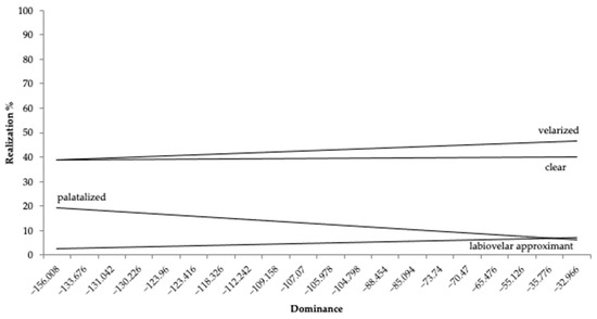 The third research question addressed the influence of dominance in Ukrainian over Russian on the production of the L3 Polish lateral. The results indicated that language dominance produced a small significant result, revealing influence on the type of lateral produced by the speakers (Figure 6). The effect was visible in a smaller number of palatalized laterals among speakers that were more balanced (closer to 0 on the dominance scale) (p < 0.01). It was also manifested in a greater number of the labiovelar approximant (p = 0.045) among the more balanced speakers. The numbers for velarized and clear laterals were not affected by language dominance (p = 0.455, p = 0.998, respectively).