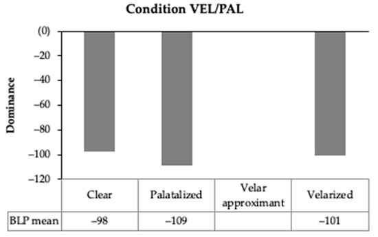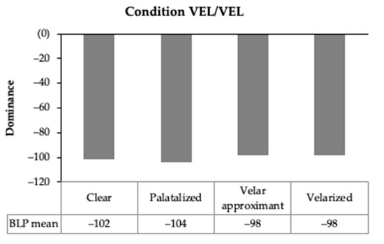 On the other hand, dominance in Ukrainian over Russian should also interact with the condition (Hypothesis 4). More Ukrainian-dominant speakers should be more likely to produce a velarized lateral condition VEL/PAL. Dominance should not matter in conditions VEL/VEL, PAL/PAL and NoCog in which both background cognates behave in the same way, or there are no cognates.