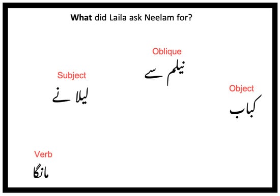 Urdu and Hindi are SOV languages. () claimed the following to be the canonical word order for these languages: “Subject—Indirect Object—Direct Object—Adjunct(s)—Verb—Auxiliaries” (p. 3). However, she reported that arguments can scramble to different positions in the sentence. This scrambling is far from random, as each linear position denotes information structure. () is one of the earliest and most elaborate analyses of word order and information structure in Hindi. Her work has heavily influenced the subsequent analyses of word order and information structure in Hindi as well as in Urdu. () built on Gambhir’s analysis to offer an account of linear position and information structure in Urdu. Using data from personal exposure to the Urdu language in Lahore, Pakistan and Hindi in New Delhi, India, () explain that the sentence initial position in Urdu is used for topicalization and scene setting, whereas the immediately preverbal position is used to mark narrow focus. The sentence final position is reserved for heavy NP shifting, news announcements, de-emphasis, background information, and to denote emphasis on new information (; ). Below, (1) illustrates the association of information structure with various linear positions.