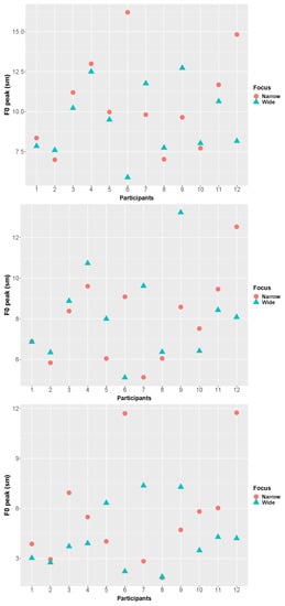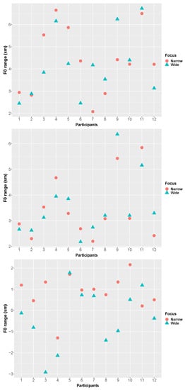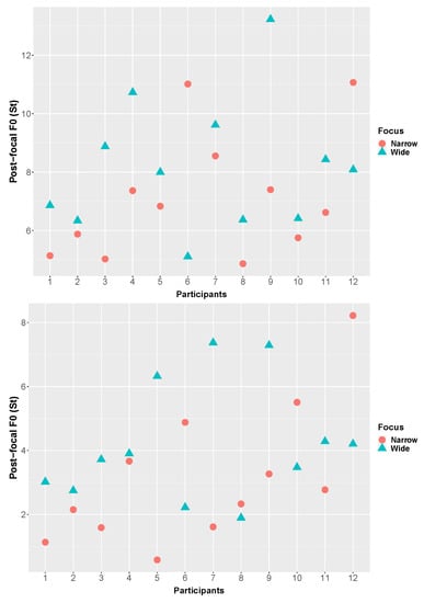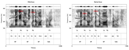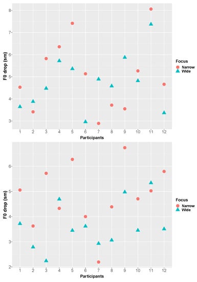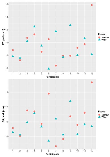 The semitone difference between the F0 peak and the immediately preceding L on focused nouns was used to calculate the F0 range of the target nouns.