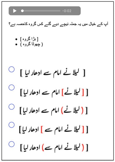 An example of stimulus presentation. The red labels indicating the grammatical role of each chunk of text is added here only for the readers of this study.