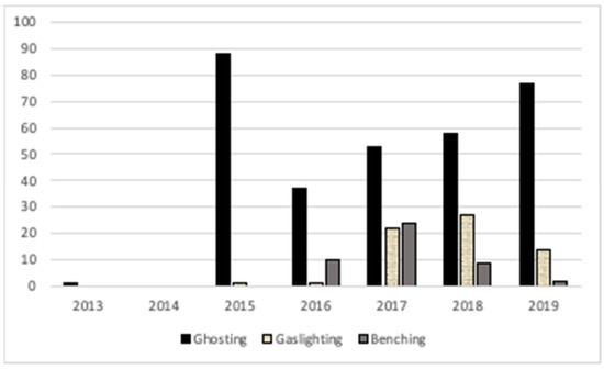 With regards to when and where these data occur, the word that was first used with its romantic meaning was ghosting, since the first time it was included in a publication was 2013. On the other hand, we found that the most recently introduced word is curving, in 2019. The data indicate a relation between the frequency of use and the date these words were first used with their romantic meaning. The borrowings ghosting, gaslighting and benching obtain the highest percentages of representation in the NOW Corpus, and these terms also have the least recent dates of appearance: 2013, 2015 and 2016, respectively. We would hypothesize that the use of these three romantic borrowings would increase in frequency each year, but that is not necessarily the trend that we found. Below, in Figure 1, we present the frequency per year of the three most used borrowings, namely ghosting, gaslighting and benching: