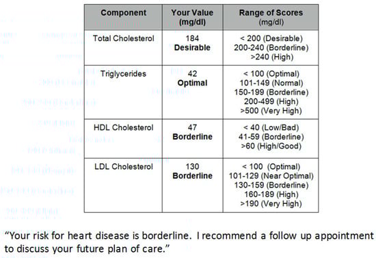 All materials and measures were presented in American English. Six scenarios with fictitious patient profiles that contained descriptions of the patient’s results from cholesterol screening tests were developed by working with two physician collaborators. The described results contained complex patterns of scores across multiple components—total cholesterol, triglycerides, high-density lipoproteins (HDL), and low-density lipoproteins (LDL), which in combination suggested low, borderline, or high risk for cardio-vascular illness. To help patients understand the overall risk for each message, a summary of the overall risk associated with the four component scores followed each message. Because these risk levels reflect patient-specific factors (e.g., family history of cardio-vascular diseases) as well as the scores, patient profiles were included in each message. The messages were presented in table format with scores accompanied by minimal description of their respective scales, similar to test results found in actual patient portals (see Figure 1 below). In addition, the table was ‘verbally enhanced’ with labels for evaluative categories (more versus less risk) and additional information about the regions of risk associated with the scale for each score. This additional information provided context to help participants interpret the specific numbers.