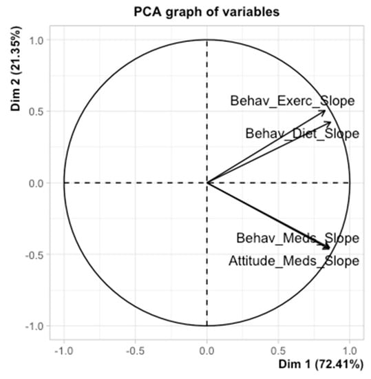 We conducted a Principal Component Analysis (PCA) for reducing the dimensionality of these four measures of self-care behaviors. Two components retained 93.76% of the information (see Figure 2) and were labelled for analysis as Preventive Health Behaviors (combining intent to exercise and intent to change diet; α = 0.92) and Treatment Health Behaviors (combining intent and attitudes towards taking cholesterol medications; α = 0.94).