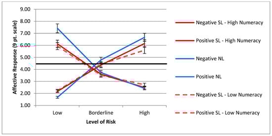 Consistent with the claim that affective distancing encourages reliance on deliberative rather than affective-based processes related to risk perception, SL participants reported greater perceived risk than NL participants did as objective risk rose (steeper slope (F[2,75] = 5.69, p < 0.01, η2 = 0.13; NL = 1.85 < SL high numeracy = 2.63 and SL low numeracy = 2.52; average slope coefficients).