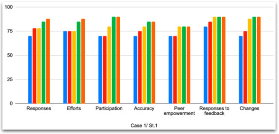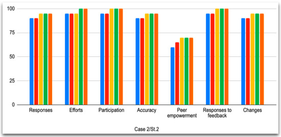 The analysis of Case 2 indicated higher levels, as can be seen in Figure 2. According to the data, most progress was recorded in efforts (95–100% over 5 weeks), participation (90–95% over 5 weeks) and responses to feedback (95–100% over 5 weeks). The levels which were also particularly high were responses, accuracy and changes. However, peer empowerment was distinctly low (60–70% over 5 weeks).