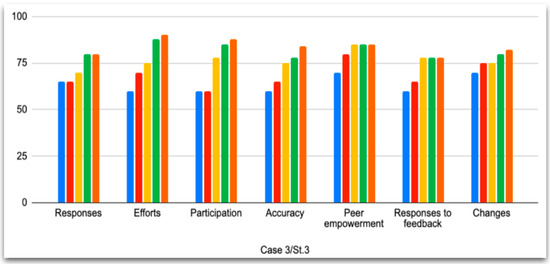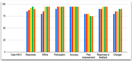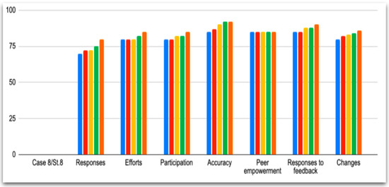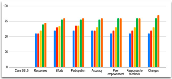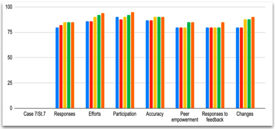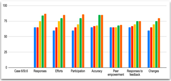 Figure 7 shows the competencies assessed in Case 7 and indicates that online assessment had high percentages and substantial progress in efforts (86% to 94% over 5 weeks), but shows inconsistency in participation (60%→65%→70%→80%→86% over 5 weeks). According to the data, less progress was recorded in responses to feedback (65%→67%→70%→75%→75% over 5 weeks), where the levels only increased in the final 2 weeks of the study and low levels of peer empowerment where there was an increase only in the final two weeks of the study (65%→65%→65%→68%→69% over 5 weeks).