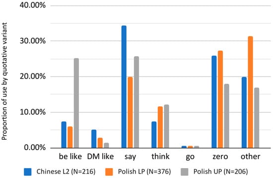 Quotative distribution among L2 groups (Chinese L2, upper and lower proficiency Polish L2 groups).