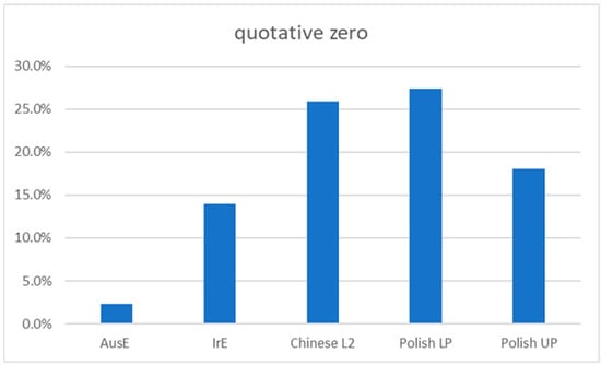 Frequency of quotative zero among two NS (AusE and IrE) and three L2 (Chinese L2, Polish Lower and Upper Proficiency) groups.