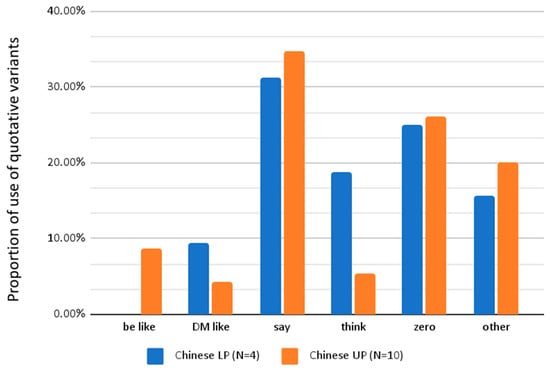 () distinguish DM like (p. 66) as a separate quotative variant from be like in their corpus of native Irish English (IrE) speakers. They report that DM like amounted to approximately 6% of the 222 quotative tokens found in their corpus of six IrE speakers, compared to 25% for be like. In other words, DM like was used approximately once every four times be like was used among native IrE speakers. The usage rates for be like (7.4%) for the Chinese L2 corpus analyzed here are lower but are similar for DM like as compared to native IrE usage at 5.1%. The AusE data could not be directly compared with the Chinese L2 data as () did not look at DM like as a separate quotative variant, and the variant was also not included in her ‘other’ category, which included write, ask, yell, tell, read, scream, and realize.