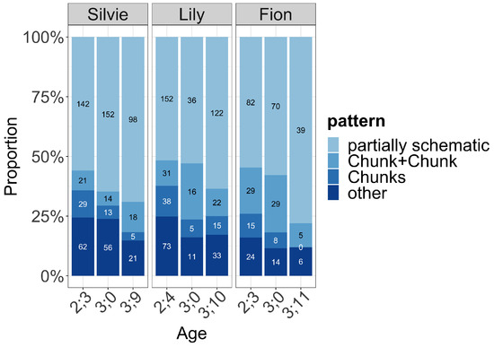 Most of the time, the chunks as well as the lexically specific parts in the frame-and-slot patterns (often analyzable as the ‘grammatical morphemes’ or ‘function words’) were from what should be seen as the language the child was more proficient in, as determined by their Mean Length of Utterance (MLU) and the analysis of her bilingual speech showed that in her frame-and-slot patterns most of the lexically specific parts were realized in German, e.g., [ich will jetzt X machen] ‘I want to make X’ in ich will jetzt the boat machen. Lily, on the other hand, was a balanced bilingual, as her monolingual MLUs were very similar to each other. Interestingly, there was no clear language preference in her frame-and-slot patterns for the lexically-specific parts, with some in German and others in English. Fion’s data showed this connection between input and output more spectacularly. Initially, he was classified as more proficient in German and indeed most of his patterns had German lexically-specific material. However, during the recording period his exposure to English went up (after his third birthday), and this change is reflected in his MLUs: his English MLU caught up with his German MLU. In his CM patterns, there was a change from mostly German-based to mostly English-based frames.