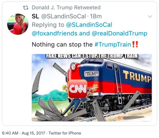 - Sullivan, Eileen, and Maggie Haberman. 2017. Trump Shares, Then Deletes, Twitter Post of Train Hitting Cartoon Person Covered by CNN Logo. New York Times. Available online: https://www.nytimes.com/2017/08/15/us/politics/trump-shares-then-deletes-twitter-post-of-cnn-cartoon-being-hit-by-train.html?searchResultPosition=1 (accessed on 9 June 2022).