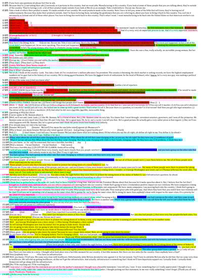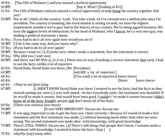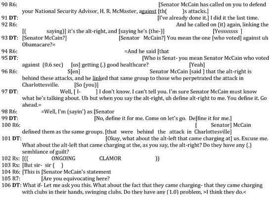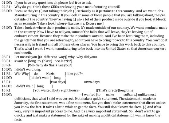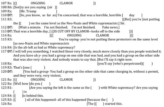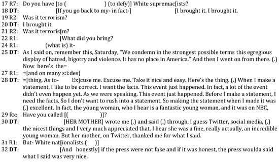 - Jacobs, Scott, Xiaoqi Zhang, and Sally Jackson. 2022. Transcript of Press-Trump Exchange from the Podium, Trump Tower lobby, August 15, 2017. [PDF Document Deposited for Open Access at IDEALS: Illinois Digital Environment for Access to Learning and Scholarship.]. Available online: http://hdl.handle.net/2142/114175 (accessed on 9 June 2022).