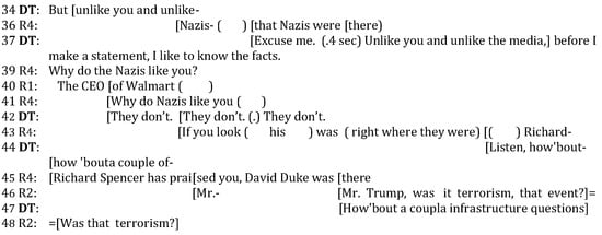 A chaotic exchange follows (see Figure 6). Reporter R4 asserts “Nazis were there” then twice shouts out the taunt “Why do Nazis like you?” (36, 39, 41; see also his prior taunts in 09 and 11, Figure 4). When Trump angrily shouts back, “They don’t. They don’t. They don’t” (42), the reporter baldly rebuts the denial without asking any question (43, 45). In turns 44 and 47, Trump asks for “a coupla infrastructure questions” and then looks at Mary Bruce, whose mention of “the CEO of Walmart” (40) may have seemed the most promising among bad alternatives.
