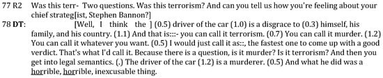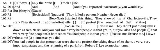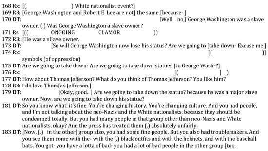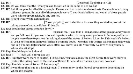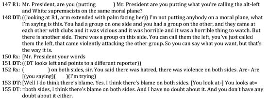 Jacobs, Scott, Xiaoqi Zhang, and Sally Jackson. 2022. Transcript of Press-Trump Exchange from the Podium, Trump Tower lobby, 15 August 2017. [PDF document deposited for open access at IDEALS: Illinois Digital Environment for Access to Learning and Scholarship.]. Available online: http://hdl.handle.net/2142/114175 (accessed on 9 June 2022).