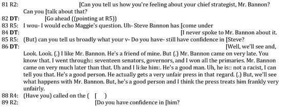 At first, Trump dodges the Bannon question. Rather than answer Haberman’s follow-up repeat of the second question (81, Figure 9), Trump calls on another reporter (82). In an unusual tag-team move, that reporter (R5) uses his opportunity to pursue an answer to “Maggie’s question” (83).