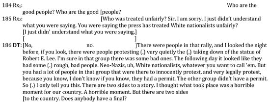 By the end of his statement in (186, Figure 17), Trump and the press corps are at a standoff. The reporters’ repeated challenges on the variations of the same topical agenda indicate that they are not at all satisfied with Trump’s answers. They do not accept that any people could be “innocently” protesting the removal of Robert E. Lee’s statue or that there could be any “good” or “fine” people in that group. They do not accept Trump apportioning blame to counter-protestors. In addition, they do not accept Trump using that blame to qualify and mitigate the condemnation of the protestors.