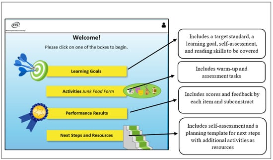 In building a prototype assessment tool, we narrowed the target users as EL students at the intermediate to advanced English language proficiency levels (including long-term ELs) and ESL teachers in secondary school, particularly in Grades 6–8. Reflecting the formative assessment framework (Figure 1), the tool was developed to include four components for teachers and students to engage in: (a) learning goals, (b) activities (assessment tasks), (c) performance results (individual score reports as well as teacher feedback), and (d) next steps and resources (students’ self-assessment, planning template, and further practice materials). Figure 2 presents the home page of this assessment tool (i.e., a learning management system) and the features included in each component. This learning management system allows both teachers and students to log on and view all components and features.
